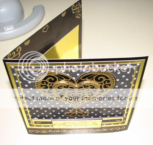 Ms_Dee used Black and Gold Metallic Papers with Hot Off the Press "Dazzles" Stacked Heart Stickers and Dots & Stripes- Paper stack - (Black/Grey Polka dot paper)